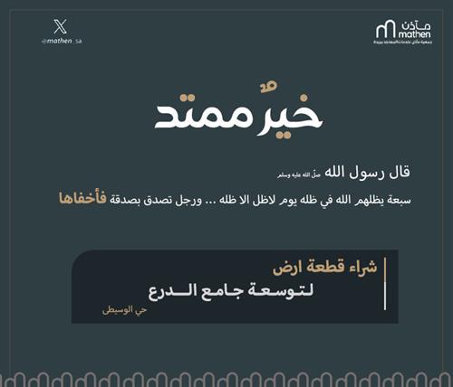 استكمال شراء أرض لتوسعة جامع الدرع بمدينة بريدة، ليكون نواةً لمسجدٍ يخدم المصلين ويُقام فيه ذكر الله وتعظيم شعائره.